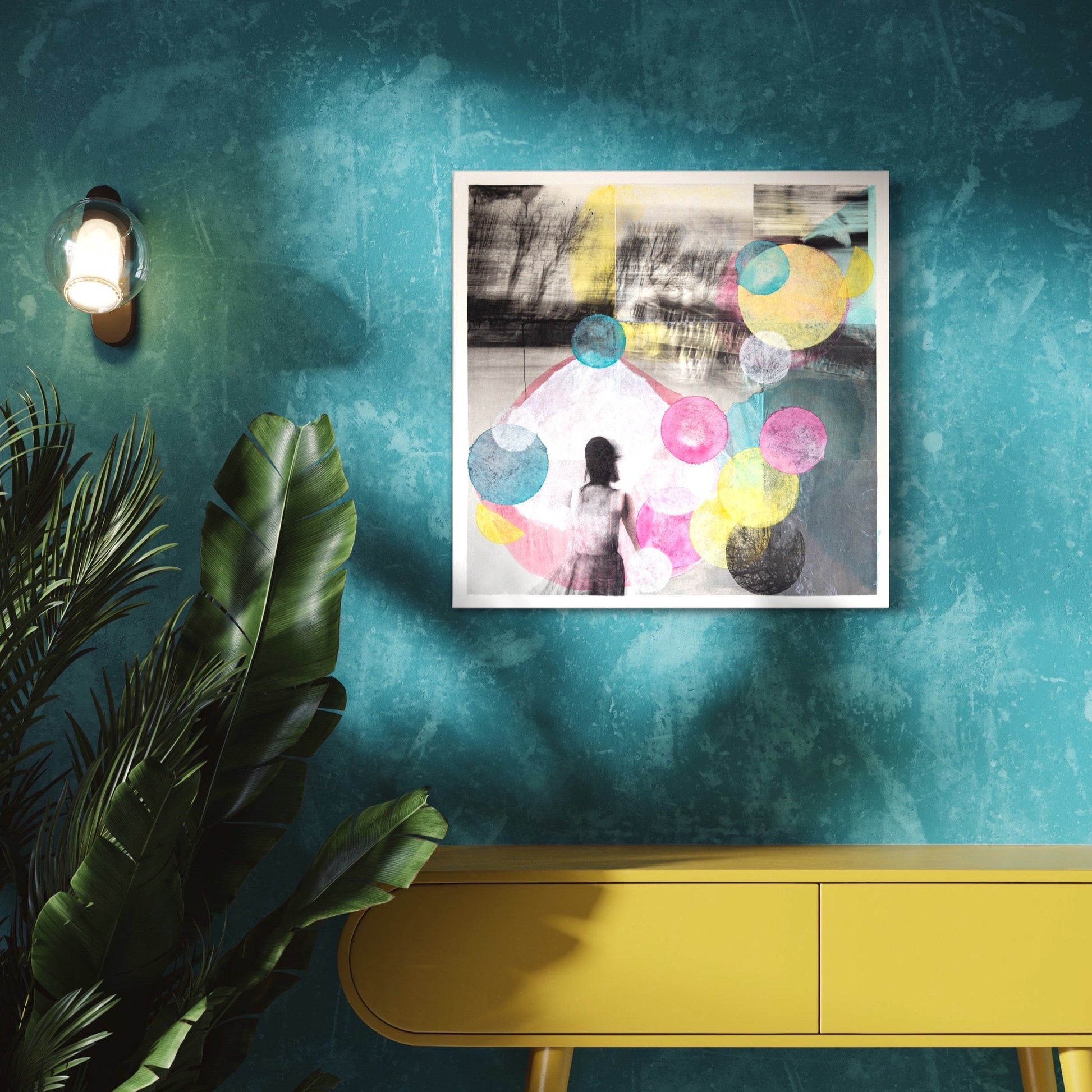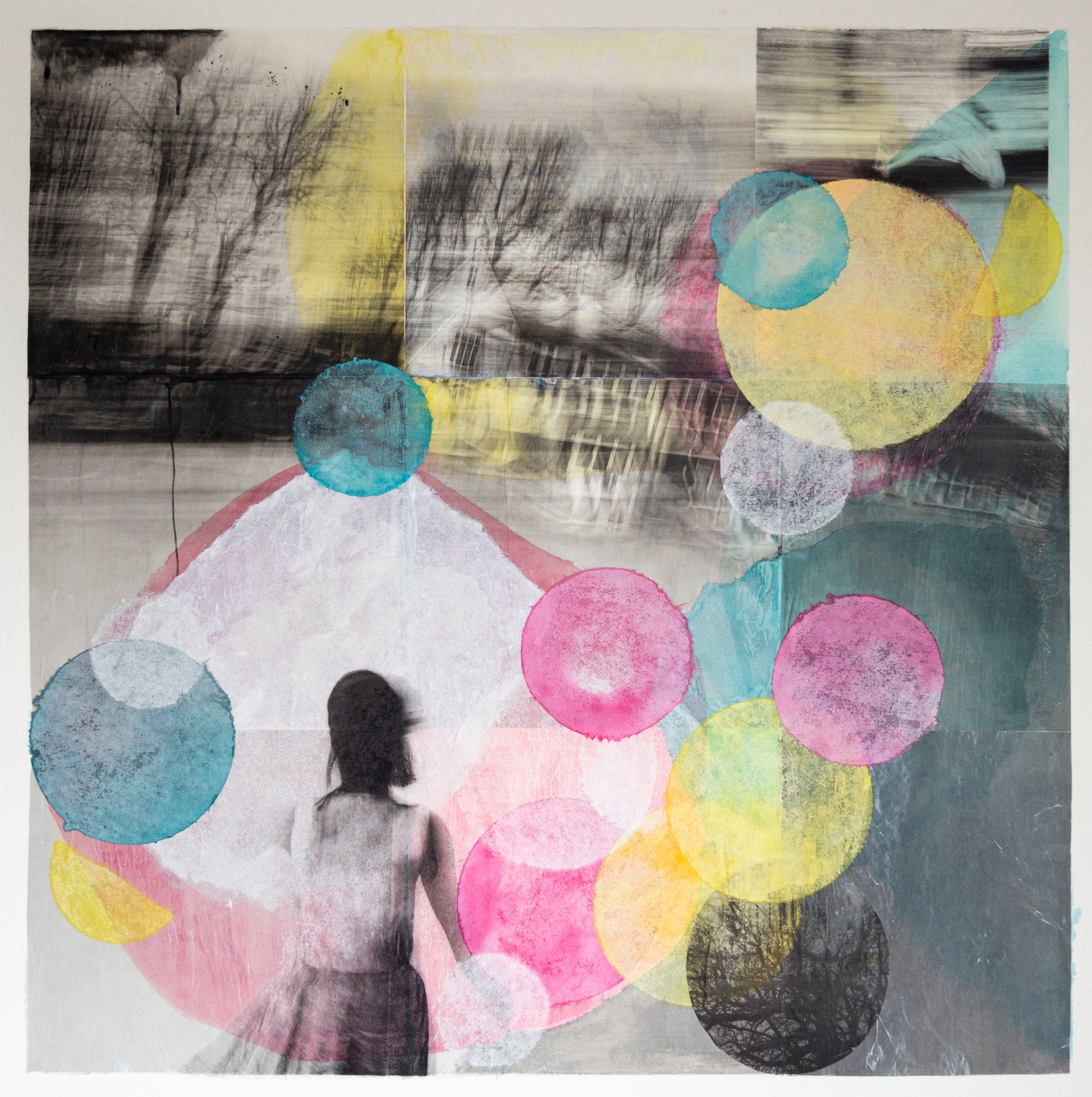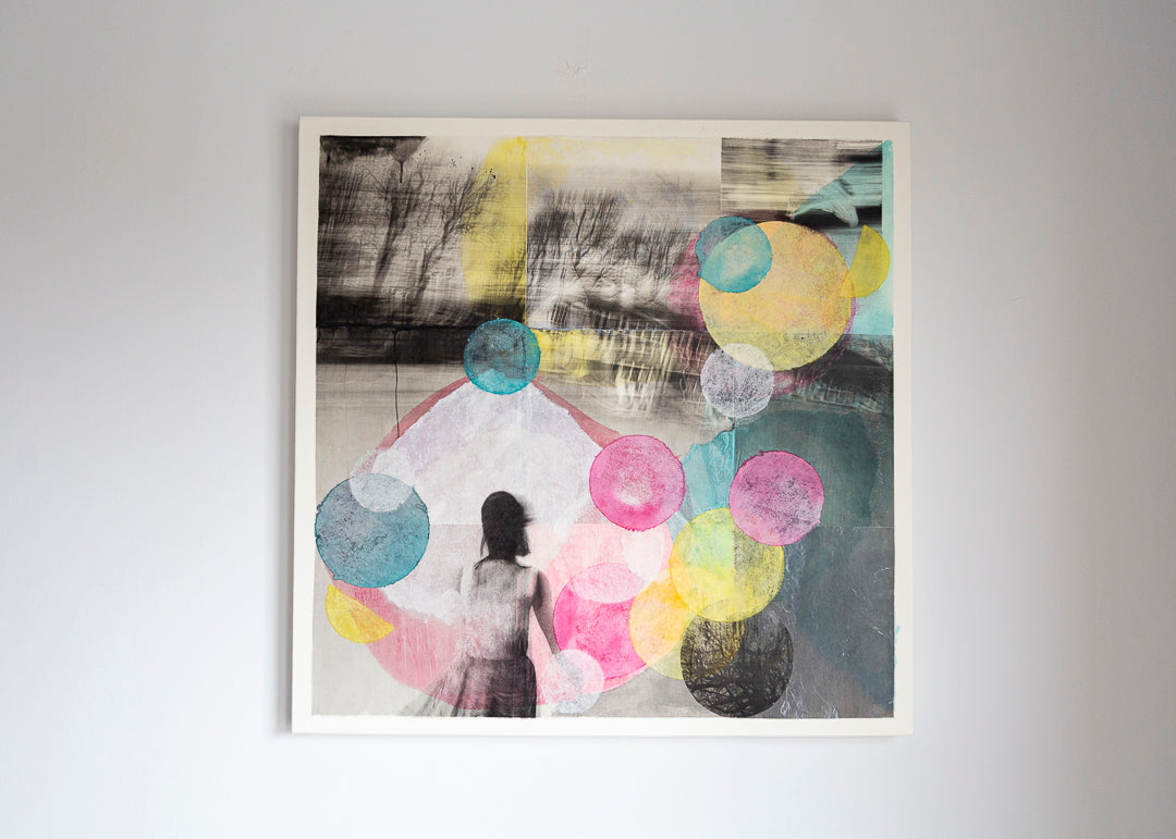 Mixed media collage on wooden board. 60x60cm. Unframed but ready to hang.