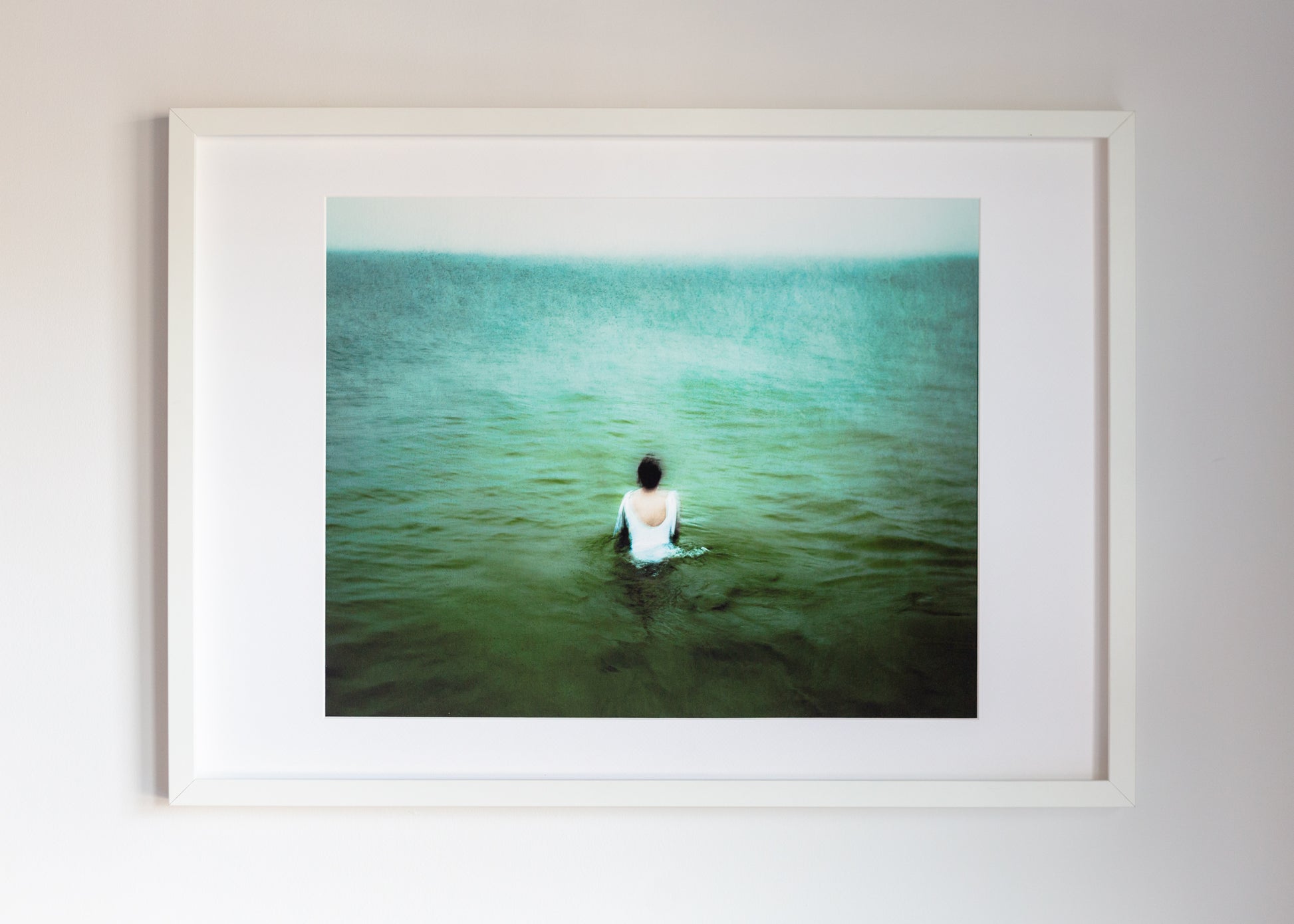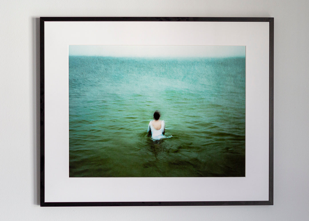 'Find the Horizon' is photographed by the Danish coast looking out over the North Sea (Kattegat). The photographic technique of intentional camera movement and slow shutter-speed creates a painterly and unsettling feel. The photograph was made in the month of December and the tones of green, teal and olive honour this season.